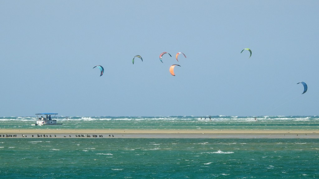 If there is a thorn in Noosa’s side it is too many tourists, but the tourists aren’t the only ones who flock to beach and estuary – the migratory birds do too. It was a hot, blustery December Sunday so amidst the hustle and bustle of Noosa there were two types of flyers – the birds and the kite surfers. I was hoping to see a Bar-tailed Godwit. I’d forgotten my bird book and binoculars, so the council bird identification board and my 83 times camera zoom would suffice. The kite surfers were spectacular – it was very windy and there were plenty of them. All eyes were on the sky until one man had a hard landing in the shallows and was taken away by ambulance. I can only hope he was fine. You could have heard a pin drop on the beach.