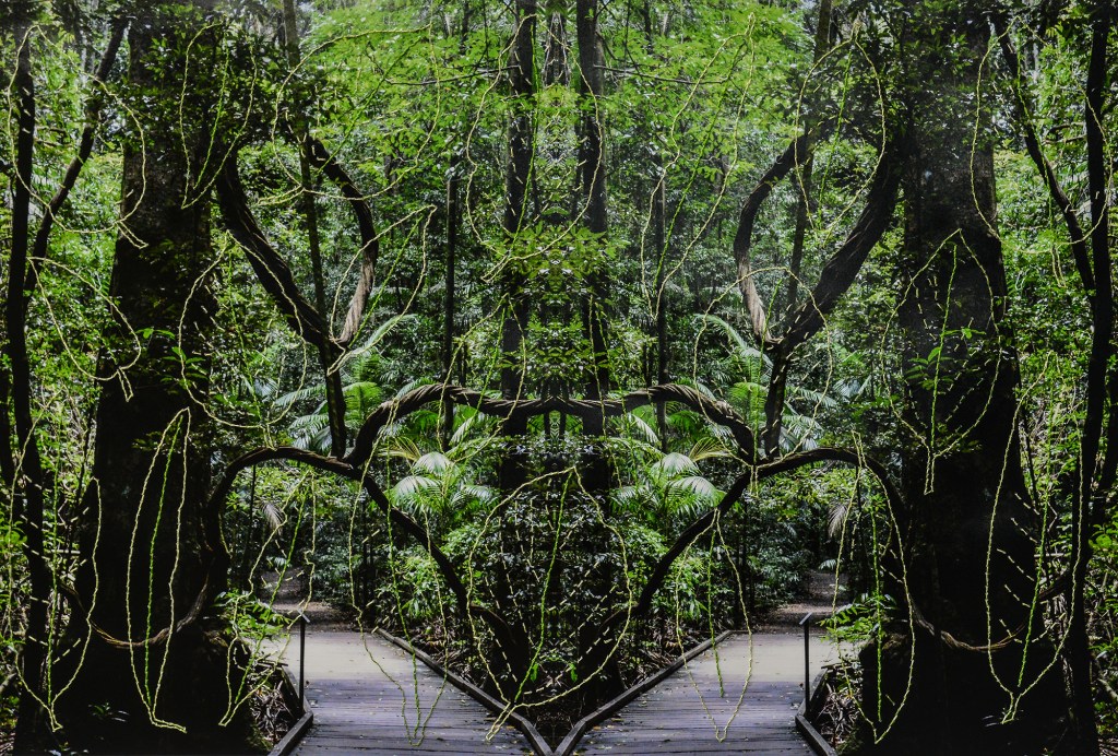 When entering the Mary Cairncross Scenic Reserve it is like wandering into another world. The temperature cools, and you are enveloped in a world of green leaves and buttressed trees. The senses are aware of the bird calls from the canopy and the rustle of a pademelon on the ground. There is also a certain wariness of snakes or leeches. My work tries to emulate the feeling of ‘difference’ discerned in this environment by using a disconcerting double perspective in the photograph, and the close proximity of the plane of hand stitched leaves in the foreground.