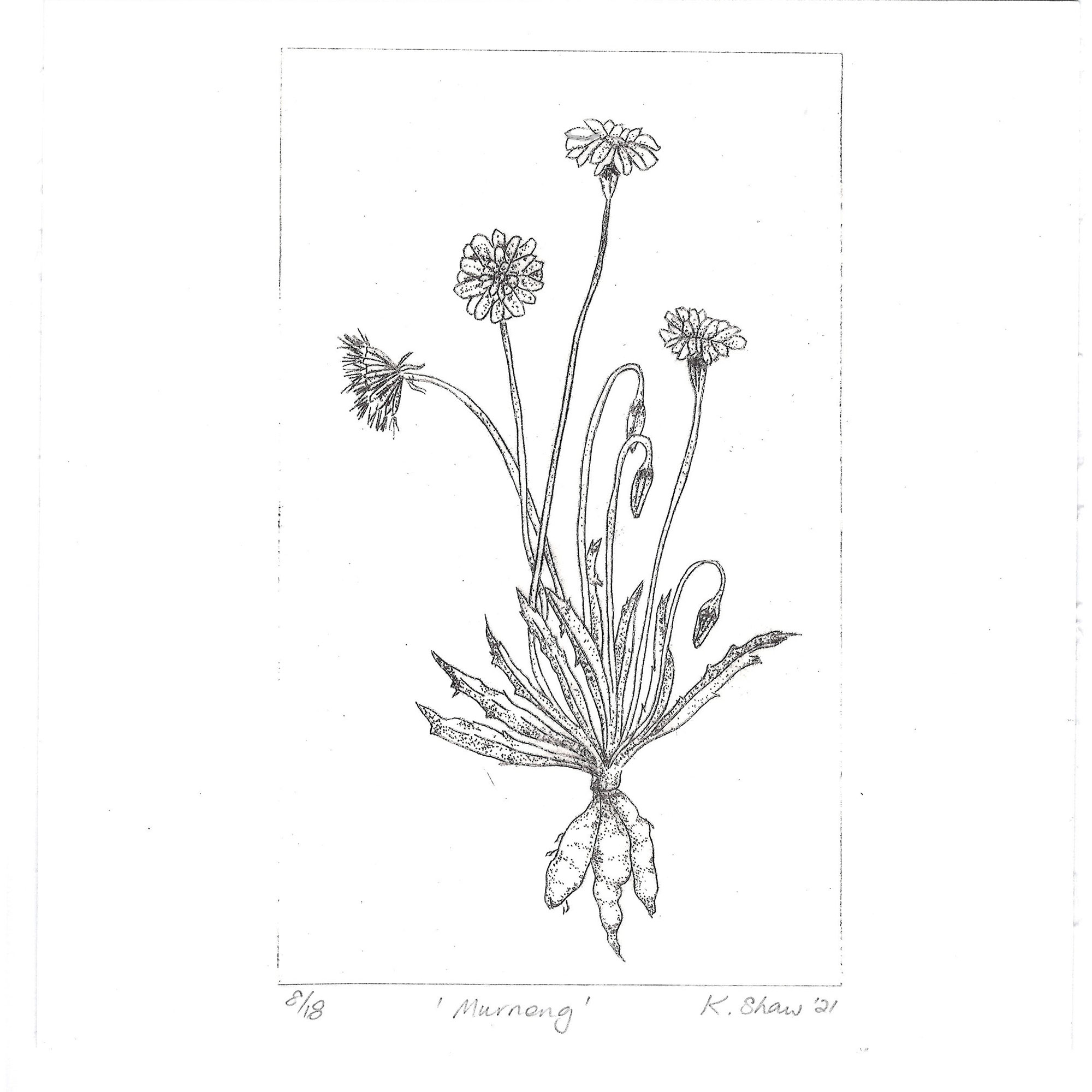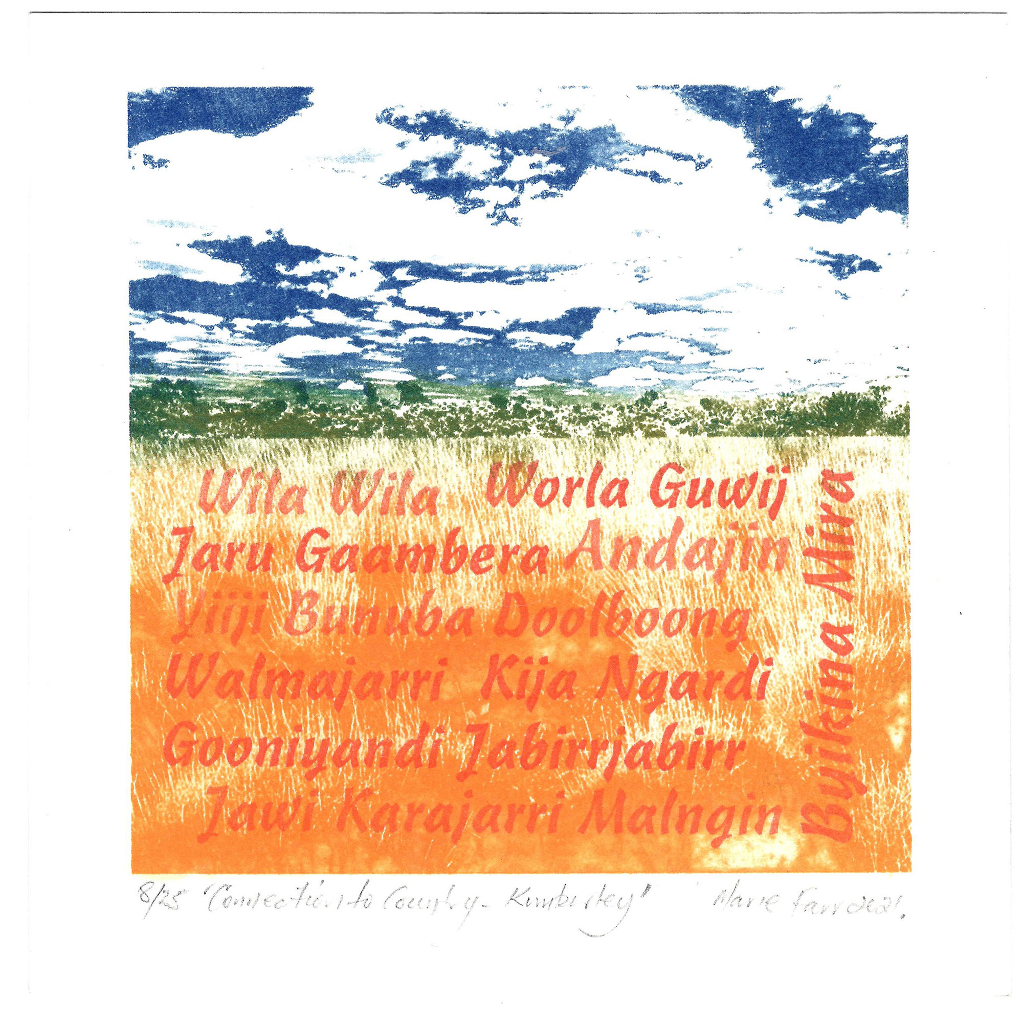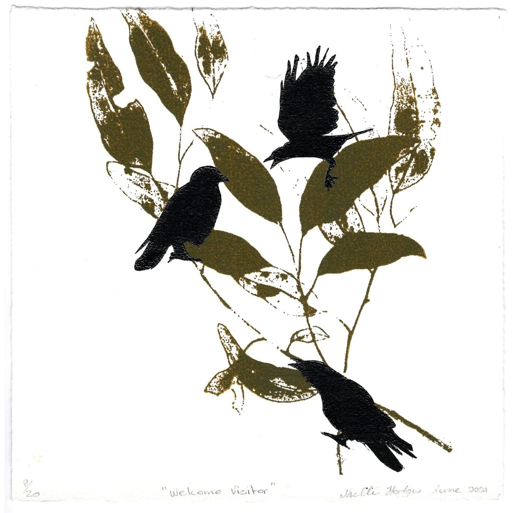 My own work, called ‘The Finch Connection’ was done with a saline etch on an aluminium plate. This was printed on Somerset paper, then handcoloured. It had come out of my trip to Bowra where the connection between the finches was obvious, as was their connection to the environment. They chose bare, dense, thorny shrubs which offer protection from predators and were also situated close to a waterhole. I’d only thought of finches as caged birds, so it was wonderful to see them in the wild.