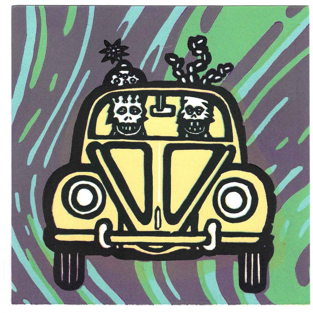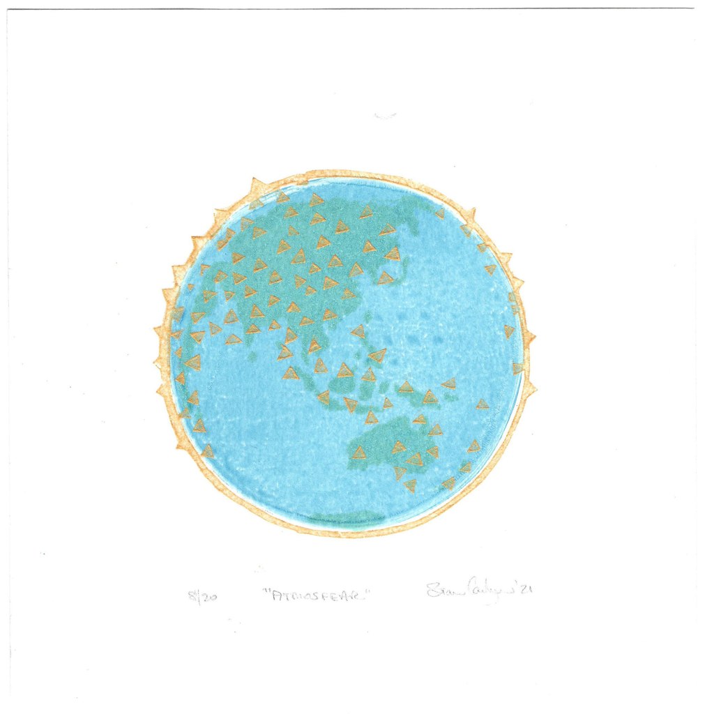 The Toowoomba group leant a bit more to current topics with Ute Braatz’s print showing figures with masks alluding to COVID and Sian Carlyon’s work to the fear spread worldwide via the virus. She also notes that we may be more connected than ever through our mutual adversity. There was also an element of quirkiness in their work.