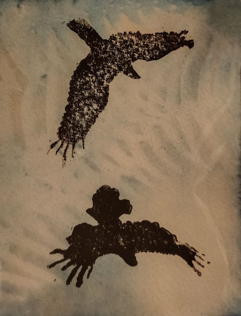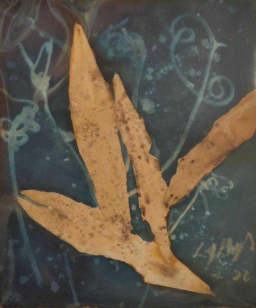 Cyanotype is a very old process – but also popular with many current artists, including the Maleny Printmakers. There were probably some pure cyanotype prints, but the ones above use combinations of media. Cholena is well known for her cyanotypes – often quite large and incorporating acrylic paint and ochre and sometimes sticks and pottery. In the above small print she used an eco print and exposed her cyanotype on top of that. The eco print gives the sepia tones, and the cyanotype the blue hue. Neville has used cyanotype as a background for his linoprint birds, and Noela has added a curved piece of copper wire to her Scribbly Gum print. I too couldn’t leave my print as a pure cyanotype one, so have used handstitching to fill in the background behind Percy the penguin.