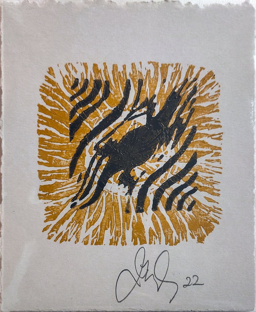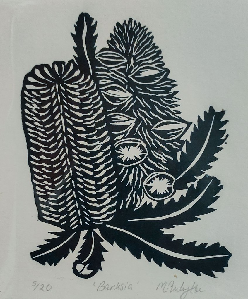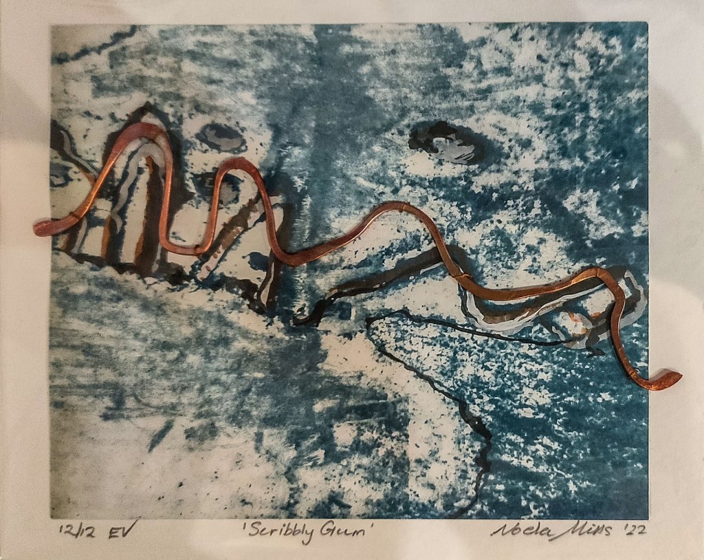 The Maleny Printmakers ‘Collectables 2022’ has been and gone – it is always a delightful little exhibition of small prints 13.5 x 11.5 cms in size and has a good following. This year it was at Munnimbah-dja an indigenous run gallery in the ‘little red house’ in the Forest Heart nursery grounds at Maleny.