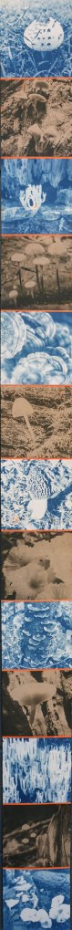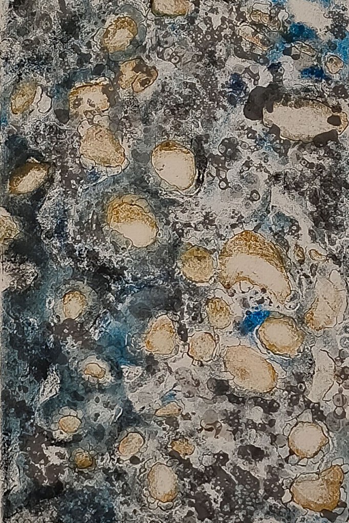 I’d enjoyed making my works for this exhibition. The theme of fungi interested me, and I can be often found with camera in hand looking for fungi pics. It became even more interesting as I became aware of the variety of fungi in the area, their importance in the ecosystem and the huge growths of mycelium under the ground. My etching Fairy Ring references the mycelium and highlights the natural science side rather than the fantasy side of the fairy ring. The other two works were cyanotype on Magnani Pescia paper. It was a new paper for me – I’d bought it for etching, but I was pleased with the results with cyanotype and also that it was tough enough for the hand stitching on Golden Curtain Crust.