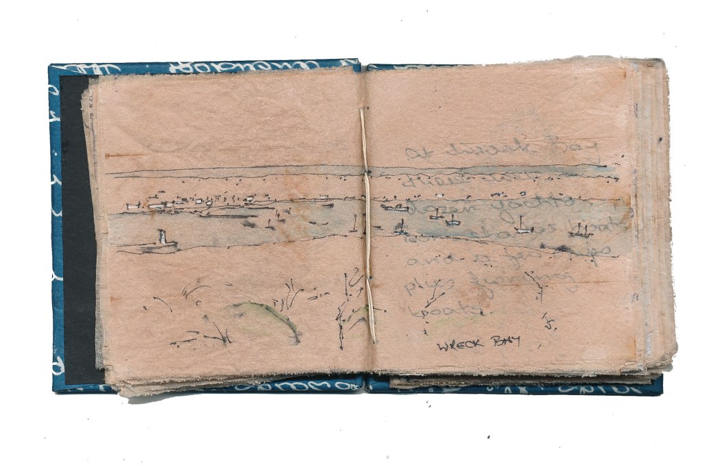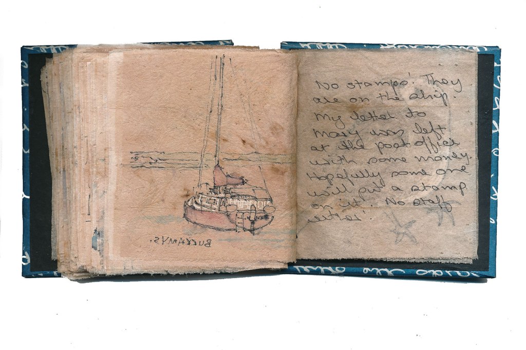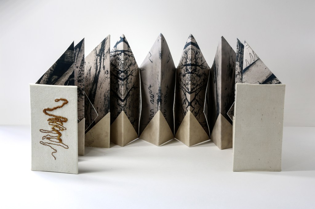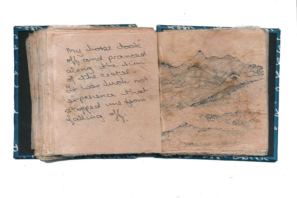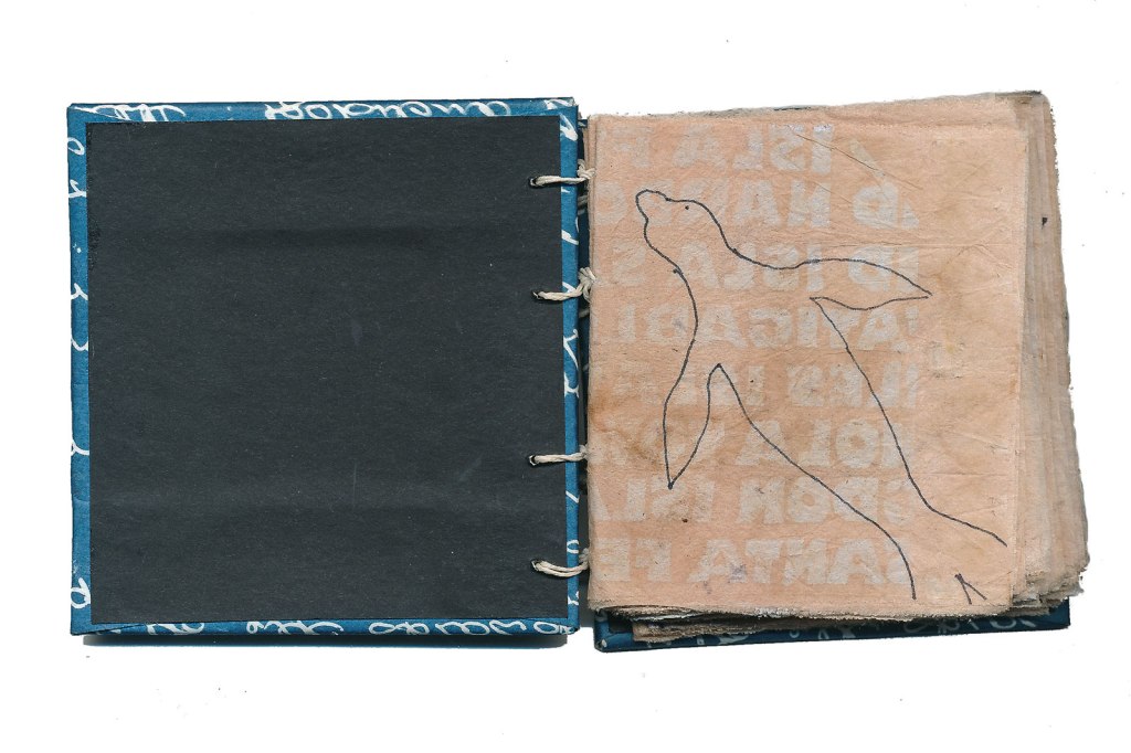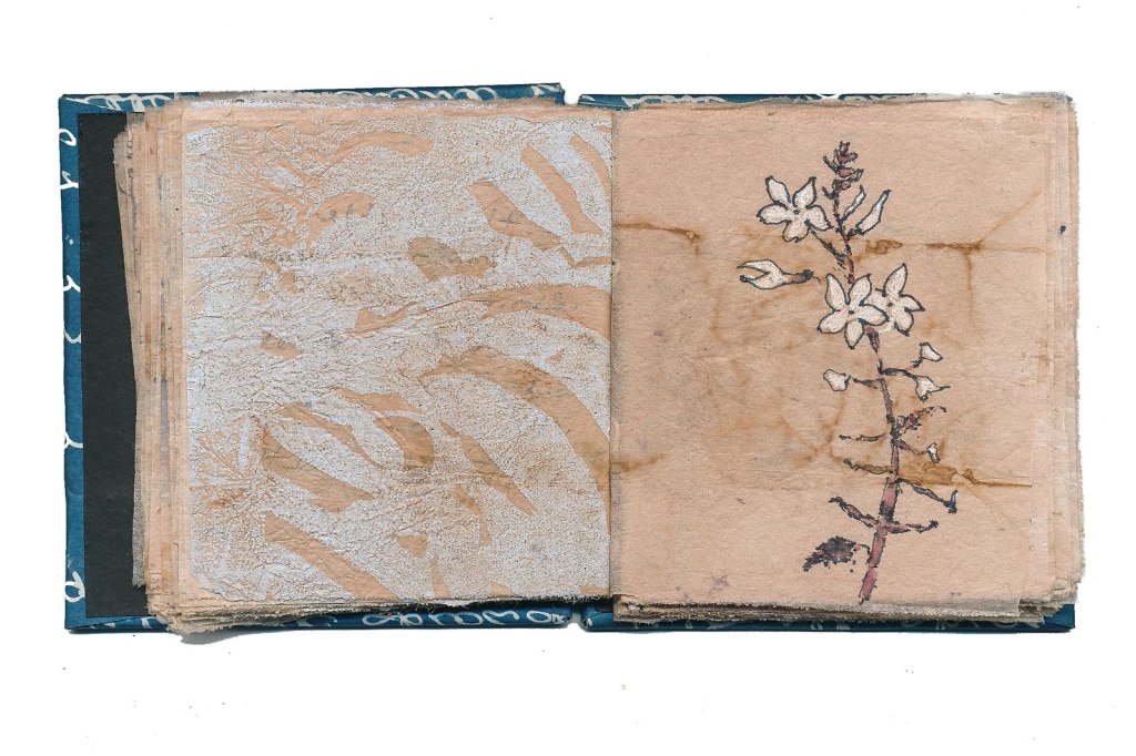 My book is a collection of sketches, journal notes, linoprints etc. – the sort of thing a traveler might have in their sketchbook. The teabag pages give a delicious tactile experience.