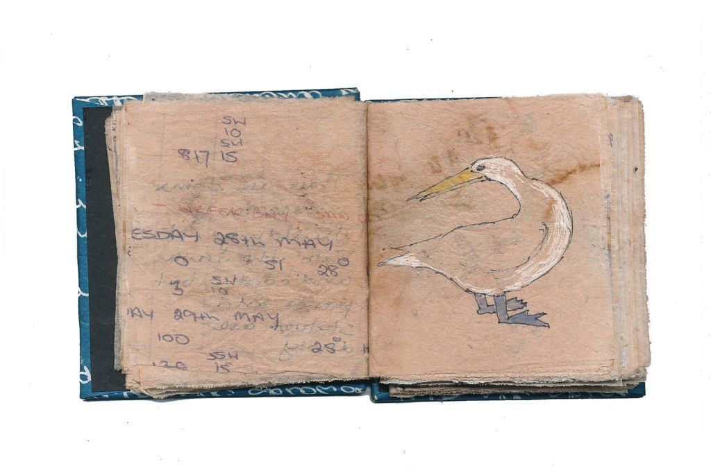 The book is 7 metres long when laid out flat, but around 3-4 metres when displayed. Salt and watercolour washed Arches paper was used and the setup of the pages reflects the days Burramys was at sea or in harbour. Handstitching lays out the routes of both Burramys and The Beagle.