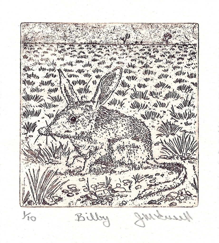 Bilby was a continuation of my ‘Endangered Species’ series. So, in keeping with the Quoll and Burramys parvus prints, it is a straightforward line drawing. The linework was drawn with a stylus into a hard ground on the plate, and then etched.