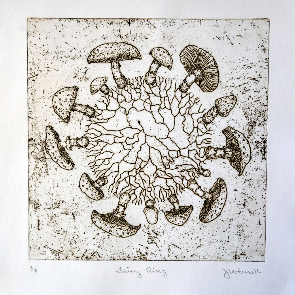 Fairy Ring is around 30cm x 30cm – an aluminium plate printed on Magnami Pescia paper with Charbonnel ink. There are many myths regarding ‘fairy rings’, however the more scientific viewpoint reveals the underground connection of the fungi. The fungi are connected by a mass of ‘threads’ called mycelium. Occasionally fungi appear at the edge of a circular mass of mycelium as fruiting bodies and present as a ring of mushrooms i.e. the fairy ring.